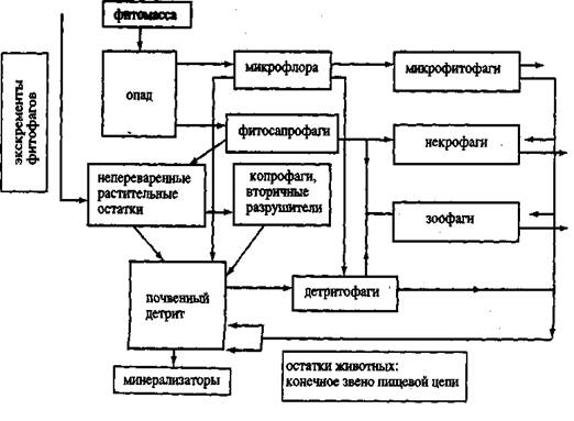 Детритная пищевая цепь почвенного яруса экосистемы играет огромную роль в потоке энергии. Согласно многочисленным литературным данным доля потребляемой первичной продукции фитофагами изменяется в зависимости от биоклиматических условий в пределах 2—30% в различных экосистемах. Таким образом, основная масса первичной продукции (98—70%) при отмирании растений поступает в детритный цикл разложения и наряду с продуктами метаболизма и трупами фитофагов и хищников служит источником энергии и элементов минерального питания животным-сапрофагам и микроорганизмам. Большое количество органического материла поставляют в почву и отмирающие корни растений. Схема детритной пищевой цепи на примере экосистемы широколиственного леса приведена на рисунке 1.