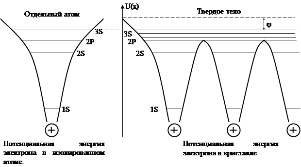 Пространственная протяженность электронных волновых функций зависит от квантовых чисел. Для больших квантовых чисел электронные волновые функции простираются на большие расстояния от ядра, для этих уровней взаимное влияние атомов будет проявляться при больших расстояниях между атомами. Что хорошо видно на рис.7, на примере уровней атомов натрия. На уровнях 1S, 2S, 2P практически не сказывается влияние соседних атомов, тогда как для уровней 3S, 3P и более высоких уровней это влияние существенно и эти уровни превращаются в энергетические зоны. Для 3S – электронов имеется энергетический минимум, обеспечивающий устойчивую твердотельную конфигурацию атомов натрия при средней межатомной расстоянии R~ 3А. В атоме натрия на энергии 3S – электрона сказывается влияние соседних атомов, означает также заметное перекрытие волновых функций этих электронов. Поэтому уже нельзя говорить о том, что конкретный 3S – электрон связан с каким-то конкретным атомом. Когда присутствие других атомов изменяет потенциальную яму отдельного атома (рис.5, рис.6), результирующий кулоновский потенциал уже не будет удерживать 3S – электроны около конкретных атомов, так что они могут находиться в твердом теле где угодно в результате перекрытия волновых функций 3S – электронов. Но 3S – электроны не могут свободно покидать твердое тело, так как их волновые функции не «выходят» за пределы вещества. Энергия связи электронов в твердом теле равна работе выхода φ.