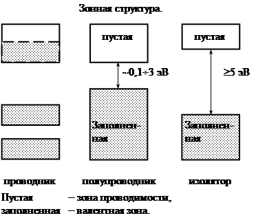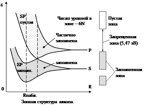 Волновые функции S и P – электронов образуют одну совершенно пустую гибридную SP – зону и одну заполненную гибридную SP – зону. Заполненная и пустая зоны разделены довольно значительным энергетическим интервалом или зоной запрещенных значений энергии. Для изоляторов типичное значение ширины запрещенной зоны ~ 5 эв и больше. Ширина запрещенной зоны для полупроводников (германия 0,67 эв, кремния 1,12 эв) находится в пределах 0,1 ¸ 3 эв.