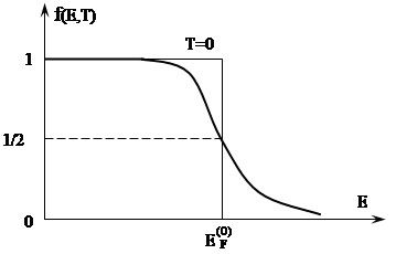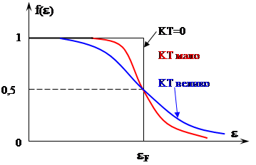 Распределение Ферми – Дирака при различных значениях КТ показано на рисунке. Здесь энергия Ферми имеет смысл энергии уровня, которому отвечает 50%-ная вероятность заполнения.