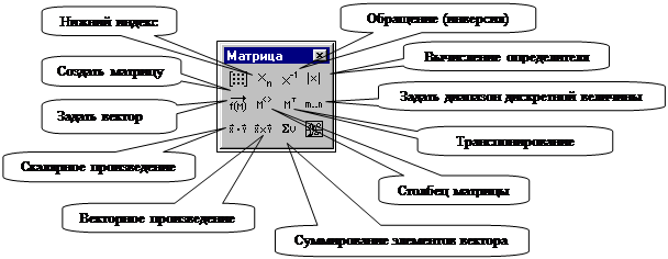 Функции, предназначенные для работы с задачами линейной алгебры, собраны в разделе “Векторы и матрицы” диалога “вставить функцию” (напоминаем, что он вызывается кнопкой на панели “Стандартные”). Основные из этих функций будут описаны позже.