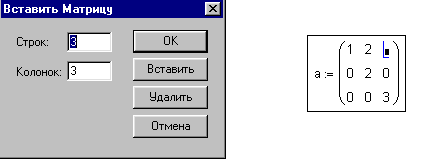 После нажатия кнопки OK открывается поле для ввода элементов матрицы. Для того, чтобы ввести элемент матрицы, установите курсор в отмеченной позиции и введите с клавиатуры число или выражение.