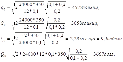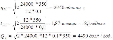 Требуется определить оптимальный размер партии q0, оптимальный период и tsо вычислить минимум общих ожидаемых годовых затрат Qо. В данном случае Т = 12 месяцам, R = 24 000 единиц, Сs = 0,1 долл./партия Сs = 350 дол/партия. Подстановка этих значений в уравнения (9), (10) и (11) дает нам.