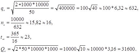 Итак, оптимальный размер одной поставки равен 632 тонны, количество поставок nо равно 16, время tso между двумя последовательными поставками равно 23 дня, а минимальные суммарные расходы составят 31600 рублей.