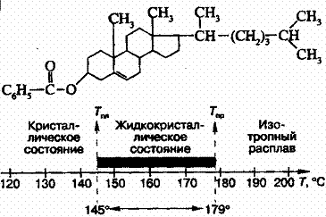 Первое ЖК-соединение — холестерилбензоат и диаграмма, иллюстрирующая температурную область существования ЖК-фазы.
