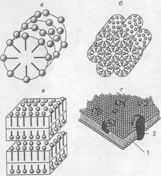 Рис. 4. Некоторые типы лиотропных жидкокристаллических структур, образованные амфифиль ными молекулами в водных растворах: а - цилиндрическ ая мицел ла, б - гексагональная упаковка цилиндрических мицелл, в - ламеллярный смектический жидкий кристалл; г - строение мембраны, состоящей из фосфолипидного двойного слоя ( 1) и молекул белков (2).
