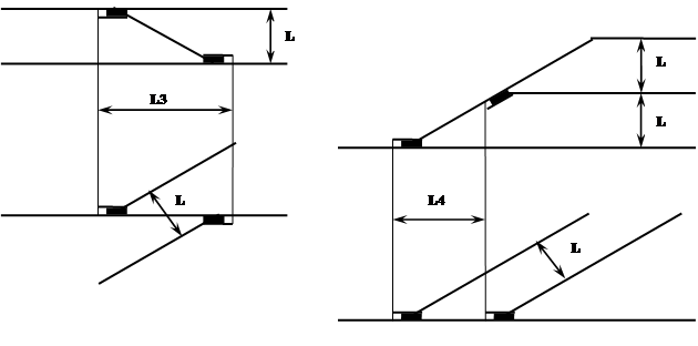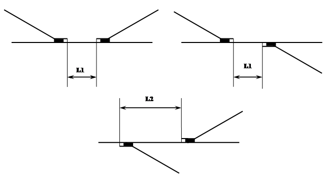 | Тип рельсов. | Марка крестовины. | Расстояние L1 | Расстояние L2 | |||