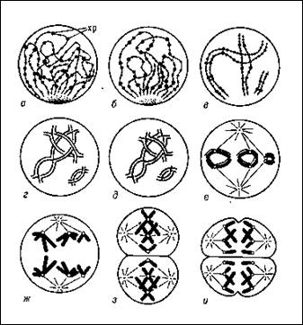 Під час і мітозу і мейозу ядро втрачає округлі контури і у ньому виразно вимальовувалися його структурні компоненти, звані хромосомами. Хромосоми мають різні форми: паличок, коротких стрижнів, капіж і так далі.