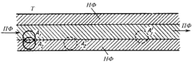 Рис. 2. Основной принцип хроматографического разделения: НФ – слой неподвижной фазы, покрывающей внутреннюю поверхность капиллярной трубки Т, через которую течет подвижная фаза (ПФ). Компонент А1 разделяемой смеси обладает большим сродством к подвижной фазе, а компонент А2 – к неподвижной фазе. А '1 и А '2 – положения зон тех же компонентов через промежуток времени, за которое происходило хроматографическое разделение в направлении, указанном стрелкой