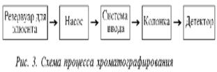 Хроматография, начавшись с самодельных устройств типа полоски бумаги, опущенной в растворитель, в настоящее время представлена сложнейшими инструментальными системами, основанными на современных точнейших, или прецизионных, принципах и оснащенными компьютерным обеспечением. Схема процесса хроматографирования, в сущности, очень проста и показана на рис. 3. Далее примерно в такой последовательности будет рассмотрен принцип работы хроматографа.