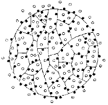 Рис. 4. Изображение структуры частицы ионообменной смолы: – заряженные функциональные группы, ковалентно связанные с нитями решетки; – свободно перемещающиеся противоположно заряженные протовоионы, электростатически связанные с частицей смолы, способные претерпевать обмен с другими ионами.