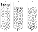 – насадочные, заполненные зернистым твердым материалом (мелкие шарики), либо являющимся разделительной средой, либо служащим носителем неподвижной жидкой фазы;