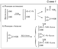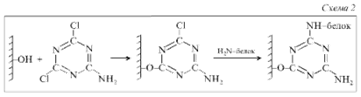 По другому способу для присоединения белков к гидроксильной группе целлюлозы последнюю сначала обрабатывают 2-амино-4,6-дихлор-сим-триазином, а затем продукт их взаимодействия вступает в реакцию с аминогруппой белка по схеме 2: