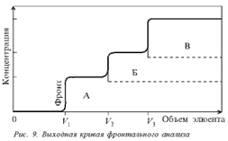 Фронтальный анализ. Это случай наиболее простой, т. к. здесь проба и служит подвижной фазой. Ее непрерывно добавляют в систему, поэтому нужны большие объемы пробы. Результаты показаны на рис. 9.