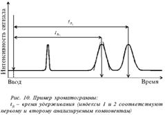 ВЭТТ является суммарной характеристикой разделения веществ. Однако разделить компоненты смеси важно, но недостаточно. Необходимо идентифицировать каждый компонент и определить его количество в пробе. Обычно это осуществляют с помощью обработки хроматограмм – зависимости интенсивности сигнала, пропорционального концентрации вещества, от времени разделения. Некоторые примеры хроматограмм показаны на рис. 9.
