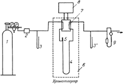 Рис. 10. Схема работы газового хроматографа: 1 – баллон высокого давления с газом-носителем; 2 – стабилизатор потока; 3 и 3 ' – манометры; 4 – хроматографическая колонка; 5 – устройство для ввода пробы; 6 – термостат; 7 – детектор; 8 – самописец; 9 – расходомер
