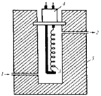 Рис. 11. Схема катарометра: 1 – ввод газа из хроматографической колонки; 2 – вывод продуктов в атмосферу; 3 – нить сопротивления; 4 – изолятор; 5 – металлический блок катарометра