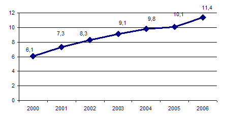 Легальное потребление абсолютного алкоголя на душу населения возросло с 2000г. практически в два раза (рисунок 1).