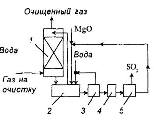 Рис. 1. схема установки очистки газа от диоксида серы суспензией оксида магния: 1 – абсорбер; 2 – нейтрализатор; 3 – центрифуга; 4 – сушка; 5 – печь.