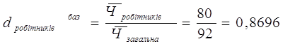 - доля робітників в загальній чисельності персоналу у базовому періоді дорівнює відношенню середньоспискової чисельності робітників у базовому році до загальної середньоспискової чисельності працівників, тобто: