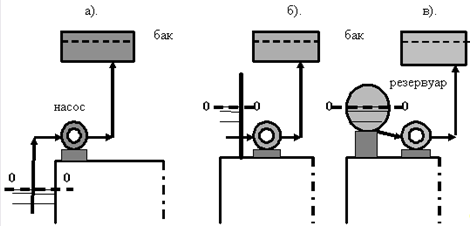 1. ось насоса выше уровня воды (0-0) в приемном резервуаре (камере) – (рис. 1, а);