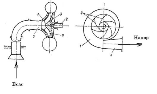 Внутри корпуса насоса 1, имеющего, как правило, спиральную форму в виде улитки, на валу 2 насажено рабочее колесо 3. Рабочее колесо состоит из заднего и переднего дисков, между которыми установлены лопасти 4, отогнутые от радиального направления в сторону, противоположную направлению вращения рабочего колеса.