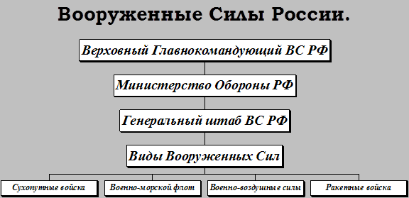 В целях обороны создаются Вооруженные силы Российской Федерации. К обороне привлекаются Пограничные войска, Внутренние войска МВД, Железнодорожные войска, войска Федерального агентства правительственной связи и информации при Президенте Российской Федерации, войска Гражданской обороны. Для решения отдельных задач в области обороны также привлекаются воинские формирования и органы Федеральных структур.