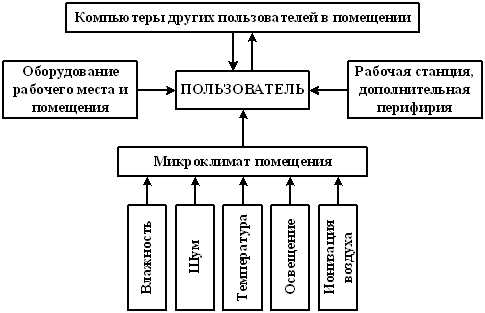 Исходя из этой системы взаимодействия, сформулируем основные требования к организации рабочих мест и рабочего процесса, которые помогут уменьшить воздействие вредных факторов от ПК. /2, С.150/