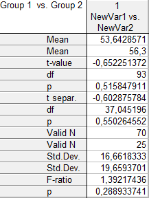 - t-separ – расчетное значение t‑критерия с учетом различных дисперсий. Очевидно, что в этом примере оно не изменяется, однако программа выдаёт другой результат.