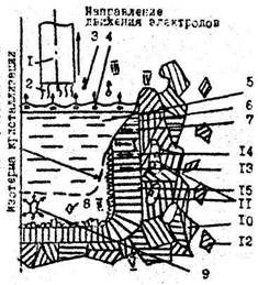1 - графитовый электрод; 2 - электродная дуга; 3 - пары оксида магния и продуктов его диссоциации; 4 - зеркало расплава; 5 - расплав; 6 - зона монокристаллов; 7 - направление теплоотвода при направленной кристаллизации из расплава; 8 - кристаллы периклаза; 9 -направление теплоотвода при объемной кристаллизации расплава; 10 - корка; 11 - нитевидные, скелетные и изометричные кристаллы периклаза, образовавшиеся из паров; 12 - осыпь; 13 -направление миграции внутрикристаллических пор; 14 - направление движения внутрикристаллических легкоплавких включений; 15 - направление термокапиллярного переноса легкоплавких примесей.