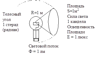 Освещенность Е – поверхностная плотность, светового потока, представляет собой отношение светового потока dФ, падающего на элемент поверхности dS, к площади этого элемента