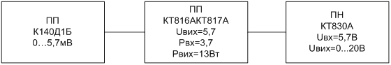ПП – підсилювач потужності, використовується для забезпечення потужності на навантаженні. Оснований на БТ КТ816А і КТ817А.