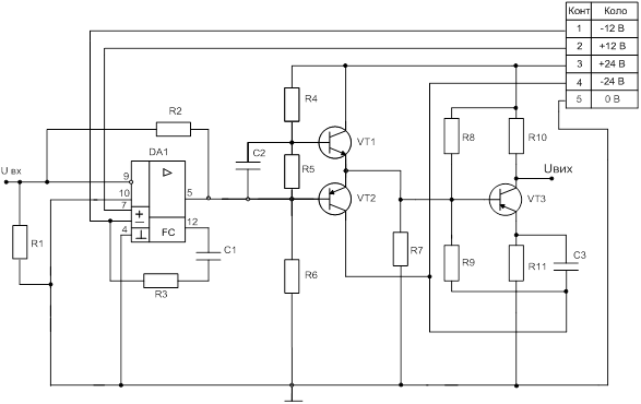 ПН – підсилювач напруги, призначений для підсилення величини вихідного сигналу по напрузі до 20В. Таким чином на виході даного каскаду отримуємо напругу 0...20В. Оснований на транзисторі КТ830А