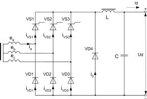 Тиристоры VS1-VS3 образуют катодную группу вентилей, диоды VD1-VD3 – анодную.В каждый момент времени ток проводят два вентиля: из катодной группы тот тиристор, на который подан сигнал управления и у которого в данный момент времени на аноде наиболее высокое положительное напряжение относительно катода, из анодной группы пропускает тот диод, у которого на катоде относительно анода наибольшее отрицательное напряжение. Коммутация диодов происходит в точках естественной коммутации. Напрямер, когда проводят VS1 и VD2, к нагрузке прикладывается линейное напряжение
