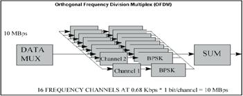 Широкополосные сигналы, получаемые мультиплексированием нескольких широкополосных сигналов с ортогональным частотным уплотнением (Оrthogonal Frequency Division Multiplex -- OFDM), представляют собой одновременную передачу на разных несущих частотах сигналов с фазовой модуляцией. Одним из ее преимуществ является высокая устойчивость к провалам в спектре, возникающим вследствие многолучевого затухания. Модуляция обеспечивает наименьшую интерференцию и спектр, весьма похожий на спектр "белого шума". Обработка OFDM обычно происходит с использованием быстрого преобразования Фурье (БПФ) и инверсного БПФ, что приводит к усложнению схем декодирования по сравнению с более простым типом модуляции.