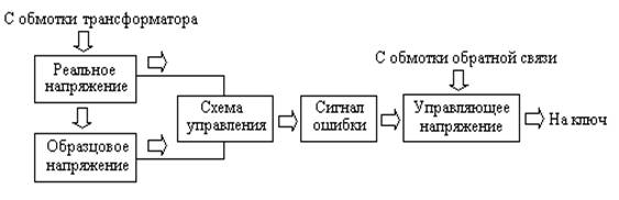 Схема управления. На схемы управления возлагается функция отслеживания уровня выходного напряжения, выработка сигнала ошибки и, часто, непосредственного управления ключом. Обычно схема управления представляет собой схему сравнения реального выходного напряжения и образцового, выработанный сигнал ошибки подается на исполнительную схему, управляющую непосредственно ключевым транзистором (см. рисунок 1.4) (2).