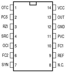 | 7 | Если требуется режим фиксированной частоты, то между этим выводом и землей должна быть соединена параллельная RC цепочка. Значение сопротивления и емкости определяют частоту. Если требуется режим синхронизации, то синхроимпульсы могут быть поданы на этот вывод. |