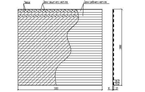 Принимаем двойной перекрестный настил, состоящий из 2-х слоев: нижнего - рабочего и верхнего – защитного (рис. 1.1). Защитный выполнен из сосновых досок 2-го сорта с обязательной пропиткой защитным составом. Минимальная толщина 16 мм и ширина 100мм. Их укладывают на рабочий (более толстый) настил под углом 45°-60° и крепят гвоздями.