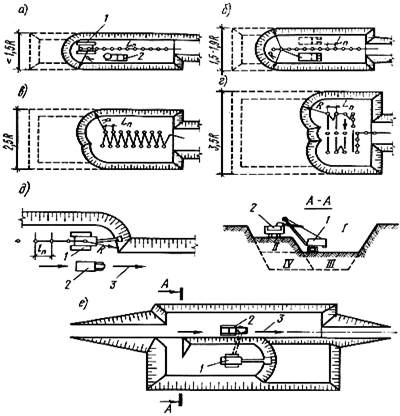 а - лобовая проходка; б - уширенная лобовая; в - поперечно-торцовая; г - боковая проходка; д - разработка котлована двумя лобовыми проходками;
