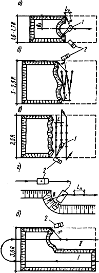 В зависимости от ширины котлована лобовая проходка экскаватора может быть прямолинейной, зигзагообразной и поперечно-торцовой. Боковая проходка применяется при разработке широких котлованов. Очертания выемки при различных проходках представлены на рис.2. Ширина лобовых проходок определяется по формулам: