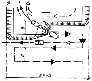 При значительных в плане размерах выемки целесообразно разрабатывать ее поперечными проходками вдоль меньшей стороны (рис.5, б). Такой способ разработки обеспечивает минимальную длину пионерной траншеи и позволяет организовать наиболее производительное кольцевое движение транспорта.