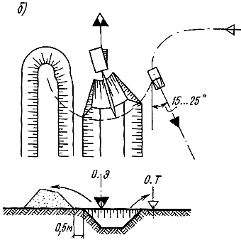 Экскаватор и транспортные средства должны быть расположены таким образом, чтобы средний угол поворота экскаватора от места заполнения ковша до места его выгрузки был минимальным, так как на поворот стрелы расходуется до 70% рабочего времени цикла экскаватора.
