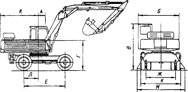 Л - от оси вращения экскаватора до оси задних колес, м+..++1