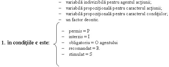Avвnd оn vedere modul оn care acюioneazг norma juridicг asupra comportamentului uman (prin impunerea unei conduite тАУ a face sau a nu face ceva тАУ prin permiterea unei conduite, prin recomandare sau prin stimulare unui gen de conduitг, din punct de vedere al logicii deontice, s-ar putea formula urmгtoarea schemг deonticг a funcюionгrii normei: