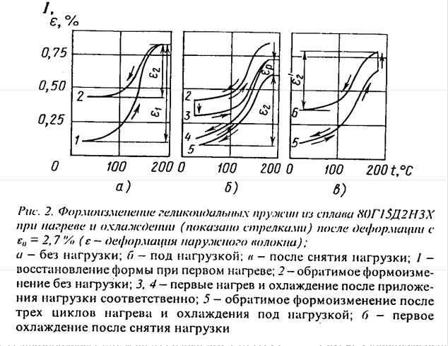 деформация в мартенситном состоянии - нагрев - охлаждение. Наиболее ярко двусторонняя память формы выражена в Mn-Cu-сплавах, в которых высокотемпературная гранецентрированная кубическая (ГЦК) у-фаза претерпевает переход в гранецентрированную тетраго-нальную (ГЦТ) фазу по механизму термоупругого мартенситного превращения. В этих сплавах значительная величина обратимого формоизменения наблюдается уже после первого цикла (деформация в мартенситном состоянии - нагрев - охлаждение) (I).