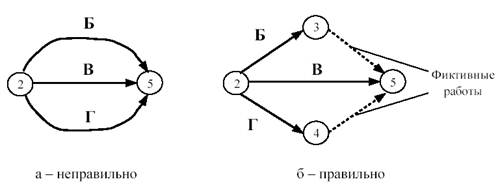 Четвертое правило. Работы сетевого графика не должны иметь одинакового кода. Если работы Б, В, Г выходят из одного события и выполнение необходимо для свершения одного и того же события, то вводятся дополнительные фиктивные работы (рисунок 4).