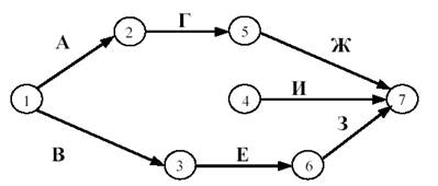 Шестое правило. Если для начала работы Ж необходимо выполнение работ В и Г, а для начала работы Д выполнение работы Г, то в сетевой график вводится дополнительная фиктивная работа (рисунок 6).