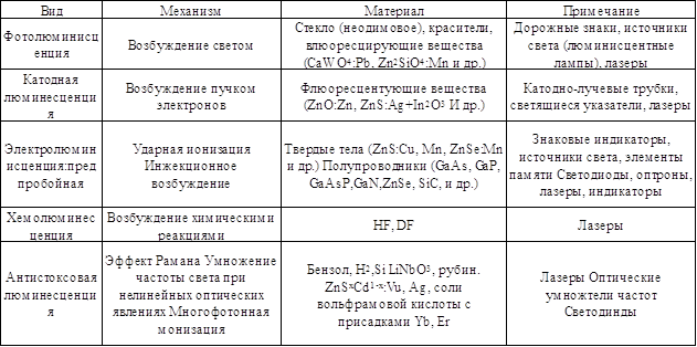 Явление, при котором вещество, либо поглощая энергию света ионизирующего или другого излучения, либо под действием различных химических реакций переходит в возбужденное состояние, а затем, возвращаясь в исходное состояние, излучает полученную энергию в виде света, называют люминесценцией. Кратковременное люминесцентное излучение, прекращающееся почти сразу с окончанием возбуждения, это флюоресценция, а длительное, продолжающееся и после окончания возбуждения, - фосфоресценция. Явления люминесценции делятся на несколько видов, в зависимости от способа возбуждения (табл. 1).