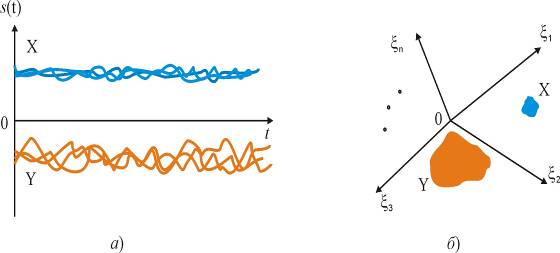 Геометрическое представление сигналов и помех связано с введением многомерного пространства выборок и широко используется в теории сигналов (7, 8). Пусть имеется реализация x(t) случайного процесса X(t). В соответствии с теоремой Котельникова эта реализация может быть представлена в виде дискретных отсчетов xi = x(iDt). Число этих отсчетов (единичных измерений) – N, совместно они образуют выборку X размером N –