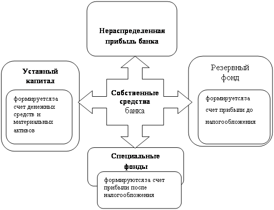 Собственные средства банка состоят из различных фондов, имеющих свое целевое назначение и различные источники формирования, которые в обобщенном виде можно представить на рисунке 2.